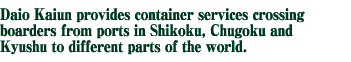 | Intermodal transport provides opportunities for significant reduction in cost of container storage and logistics. It is merging logistics of ship owners with that of forwarders that should, in our opinion, result in advancement of the industry. Promptness is most important above all in logistics. We place utmost priority on speedy and accurate customs clearance to achieve "On Time Service" . We are implementing worldwide logistic strategies to deliver goods to Taiwan, Korea and China, one example being feeder vessels in the Kyoto/Osaka /Kobe area among others. We started NVOCC efforts in 1998 FY. Through close communications with affiliated agencies in Taiwan, Hong Kong, Korea and Shanghai we deliver services that meet customer needs. We are sure our network will expand more globally. |